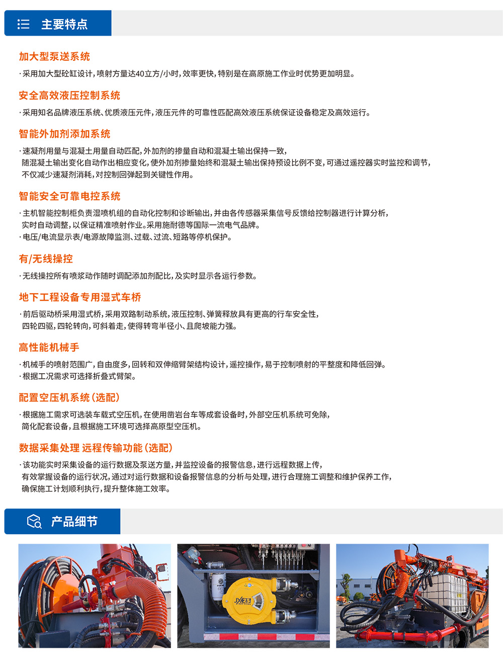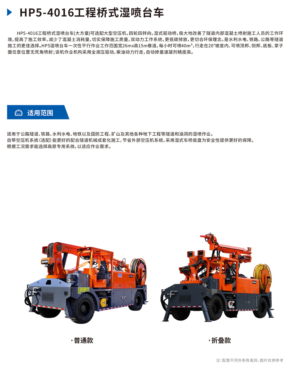 HP5-4016?程橋式濕噴臺(tái)?(??量)可選配?型空壓機(jī),四輪四轉(zhuǎn)向,濕式驅(qū)動(dòng)橋,極?地改善了隧道內(nèi)部混凝?噴射施??員的?作環(huán)境,提?了施?效率,減少了混凝?消耗量,切實(shí)保障施?質(zhì)量,雙動(dòng)??作系統(tǒng),更低碳排放,更切合環(huán)保理念。是?利?電、鐵路、公路等隧道施?的更佳選擇。HP5濕噴臺(tái)??次性平?作業(yè)?作范圍寬26mx?15m巷道,每?時(shí)可噴40m3,??在20°坡度內(nèi)、可噴頂邦、側(cè)邦、底板、掌??任意位置?死?噴射;該機(jī)作業(yè)機(jī)構(gòu)采?全液壓驅(qū)動(dòng),柴油動(dòng)???,?動(dòng)摻量速凝劑精度?。