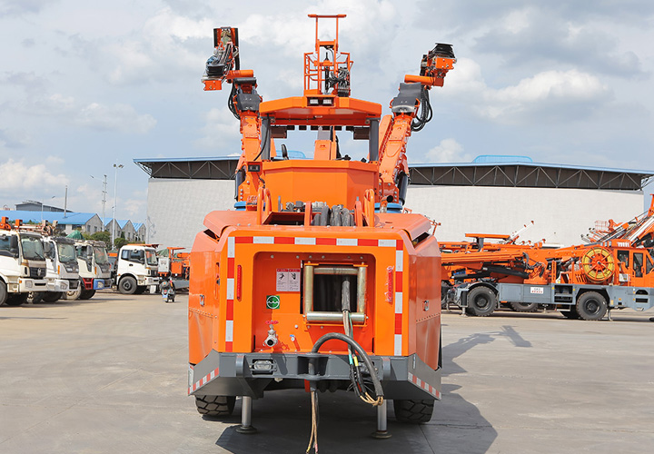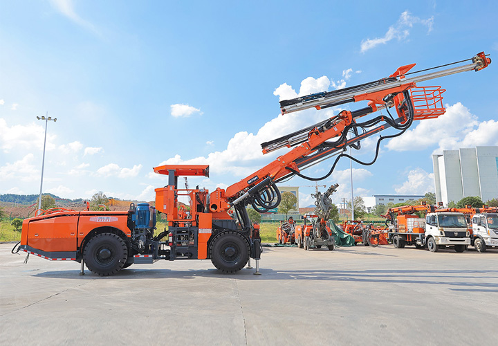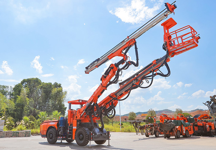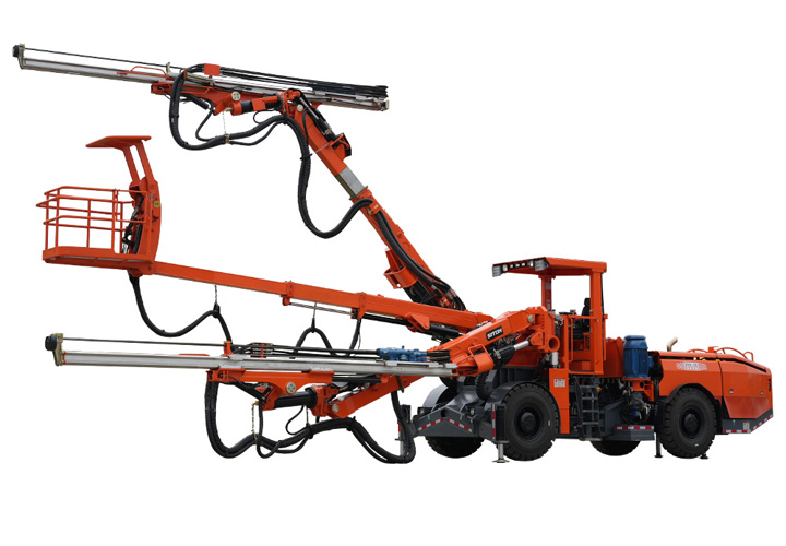 DW2-120雙臂(液壓)鑿巖臺(tái)車是一款鑿巖設(shè)備,采用兩套鉆臂為獨(dú)立液壓系統(tǒng)控制互不干涉,鉆臂可伸縮覆蓋面積廣,設(shè)有一套吊籃臂可為裝藥、排險(xiǎn)、掛網(wǎng)等輔助工作提供升降平臺(tái)。是為高速高鐵、水利水電工程、以及國(guó)防等中大型隧道掘進(jìn)鉆孔作業(yè)而研發(fā)制造的專用型鑿巖裝備,滿足鑿巖掘進(jìn)需要的各種炮孔、錨桿孔、小導(dǎo)管支護(hù)、注漿孔等,該機(jī)工作時(shí)采用全液壓驅(qū)動(dòng),電液比例閥控系統(tǒng)控制鉆臂鑿巖,動(dòng)作柔順定位迅速、鑿巖速度快;全實(shí)時(shí)液壓平動(dòng)式鉆臂使推進(jìn)梁全方位可保持平行,設(shè)有自動(dòng)防卡釬、鑿巖完畢停止沖擊、退桿等功能;柴油機(jī)供行走,四輪四驅(qū)、動(dòng)力強(qiáng)勁、轉(zhuǎn)場(chǎng)靈活,整機(jī)結(jié)構(gòu)布置緊湊、重心低、機(jī)動(dòng)靈活、系統(tǒng)穩(wěn)定,不僅提升安全保障和工作效率,又能降低勞動(dòng)者的工作強(qiáng)度。